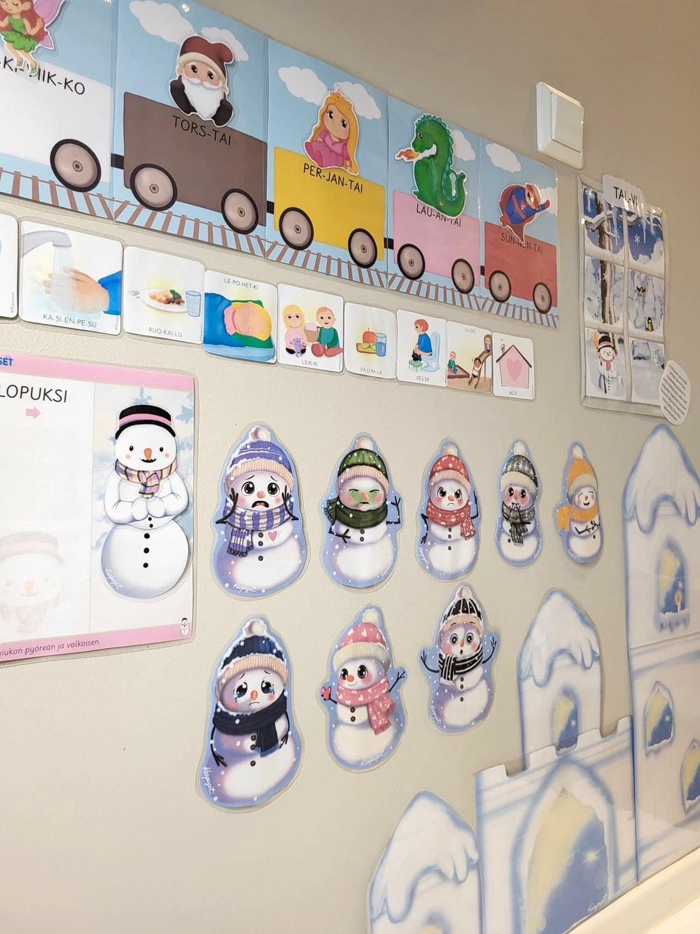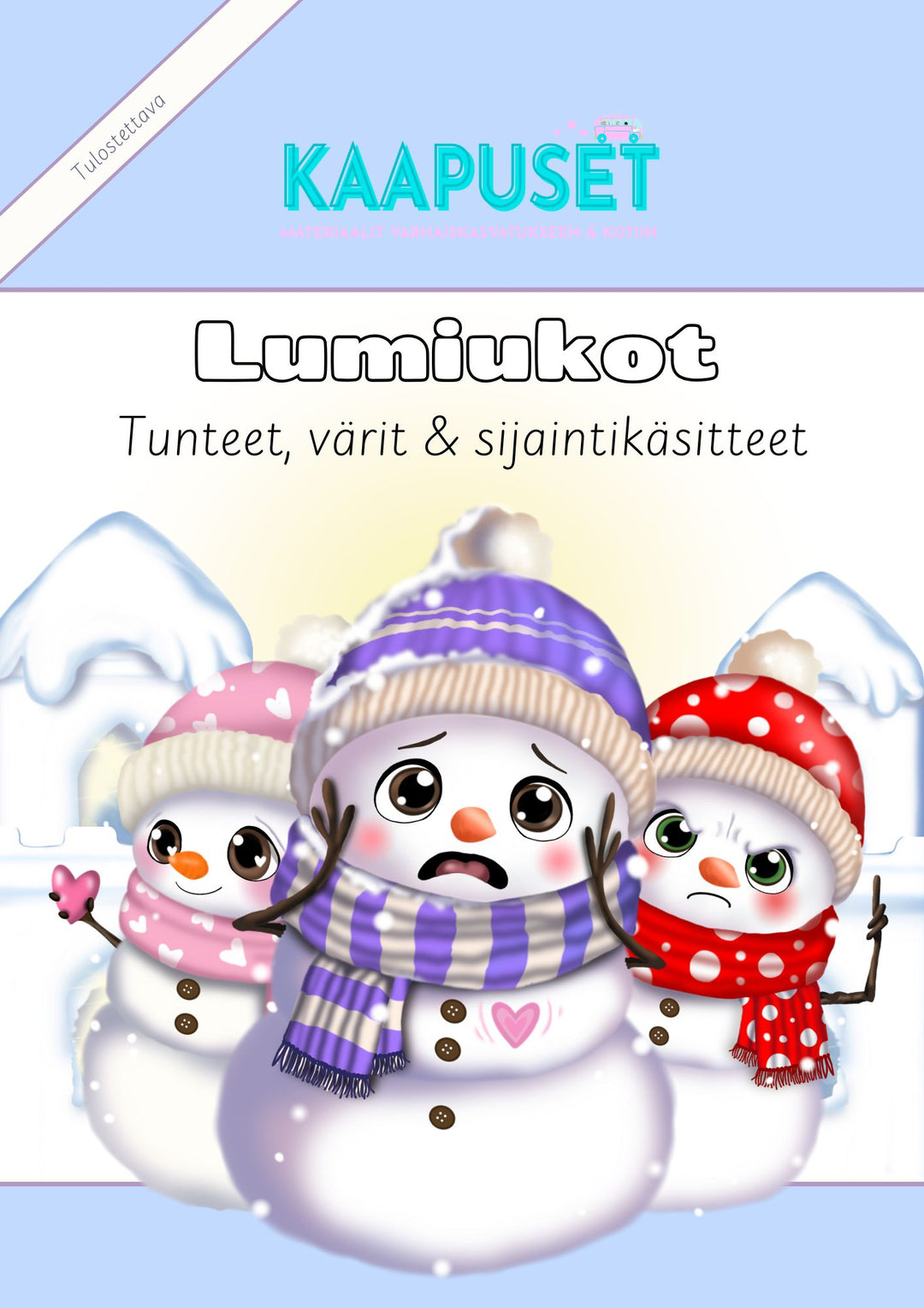 Lumiukot tuovat ryhmätilaan ihanan talvisen tunnelman ja tarjoavat monipuolisia tapoja oppia leikin avulla. Yhdellä materiaalilla harjoitellaan tunteiden tunnistamista ja sanoittamista, värejä, kehollista ilmaisua sekä sijaintikäsitteitä lumilinnan avulla.