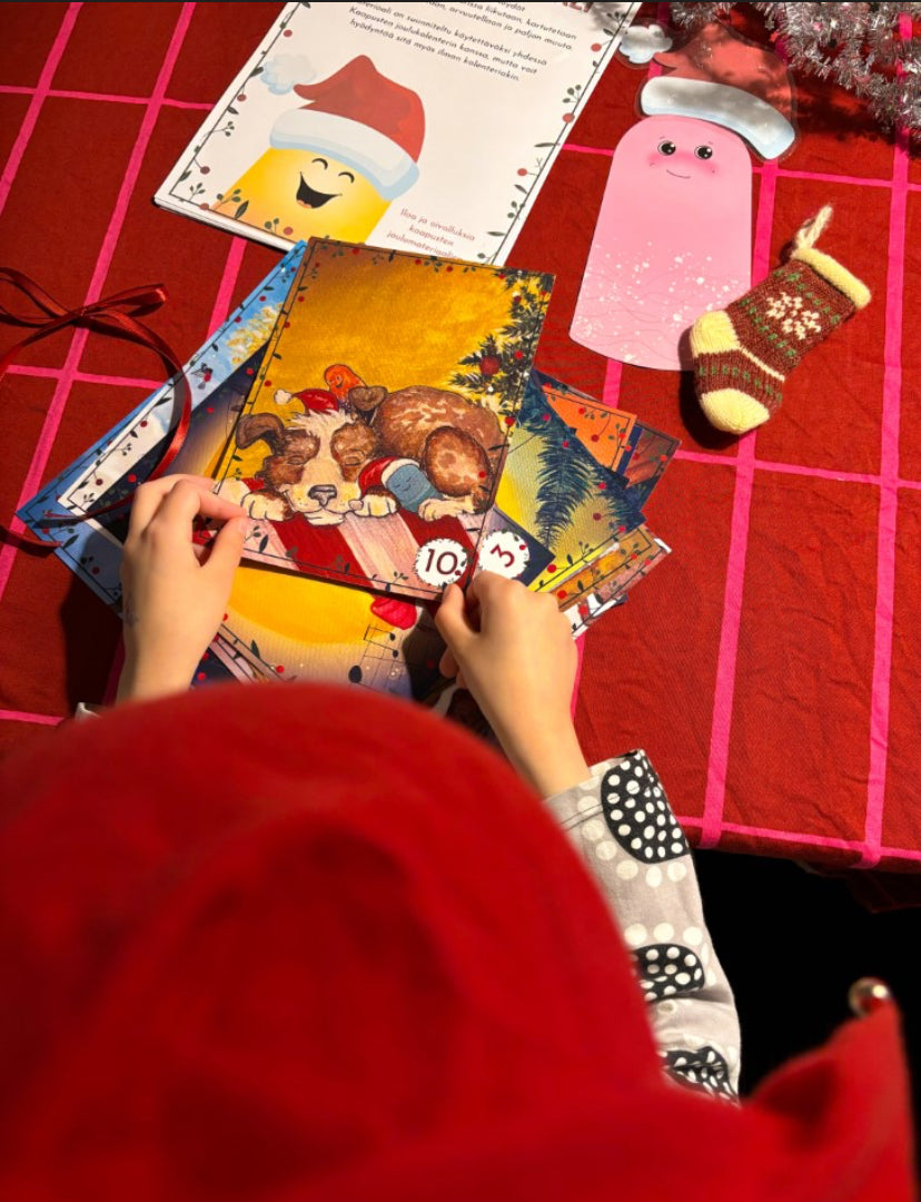 - Jokaisessa korttissa on myös lasta osallistavia kysymyksiä, jotka saattelevat teidät yhdessä pohtimaan, mikä joulun sanoma syvimmiltään on, mistä joulumieli muodostuu ja mitä kaikkea joulupuuhia Maassa on tapana touhuilla. (Ei vakaumuksellinen.) Kalenterissa on tunnetaitoteema.